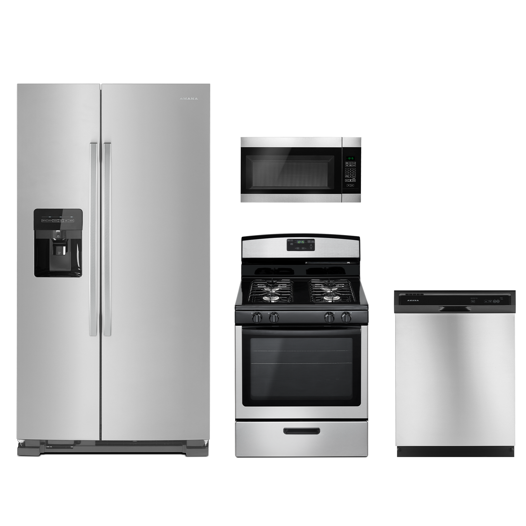 Amana® 4 Piece Kitchen Package-Stainless Steel with side by side refrigerator, Free Standing Gas Range, Built In Dishwasher and Over the Range MicrowaveRead More